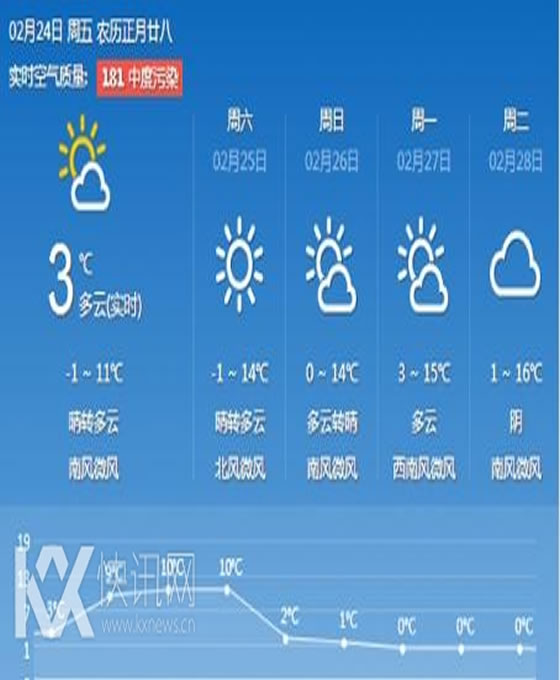 具体预报:24日我市晴间多云,西北风转西南风2~3级,气温-2~11℃;25日晴间多云,西南风2~3级,气温-1~14℃;26日多云间晴,偏南风短时北风2~3级,气温-1~14℃。