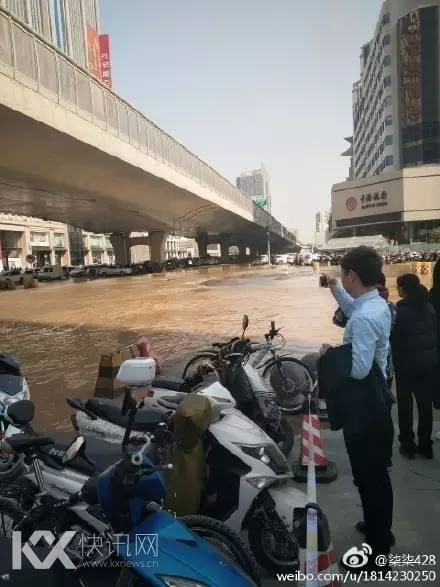 今天下午2点左右,郑州市花园路与农业路交叉口附近,因水管爆裂,不断有水一直从地下涌出,路面瞬间成河,水深及膝。