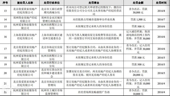 如在2015年3月份,我爱我家的北京6家分公司在办理分公司登记时向公司登记机关提交虚假材料,共受到处罚30万元。