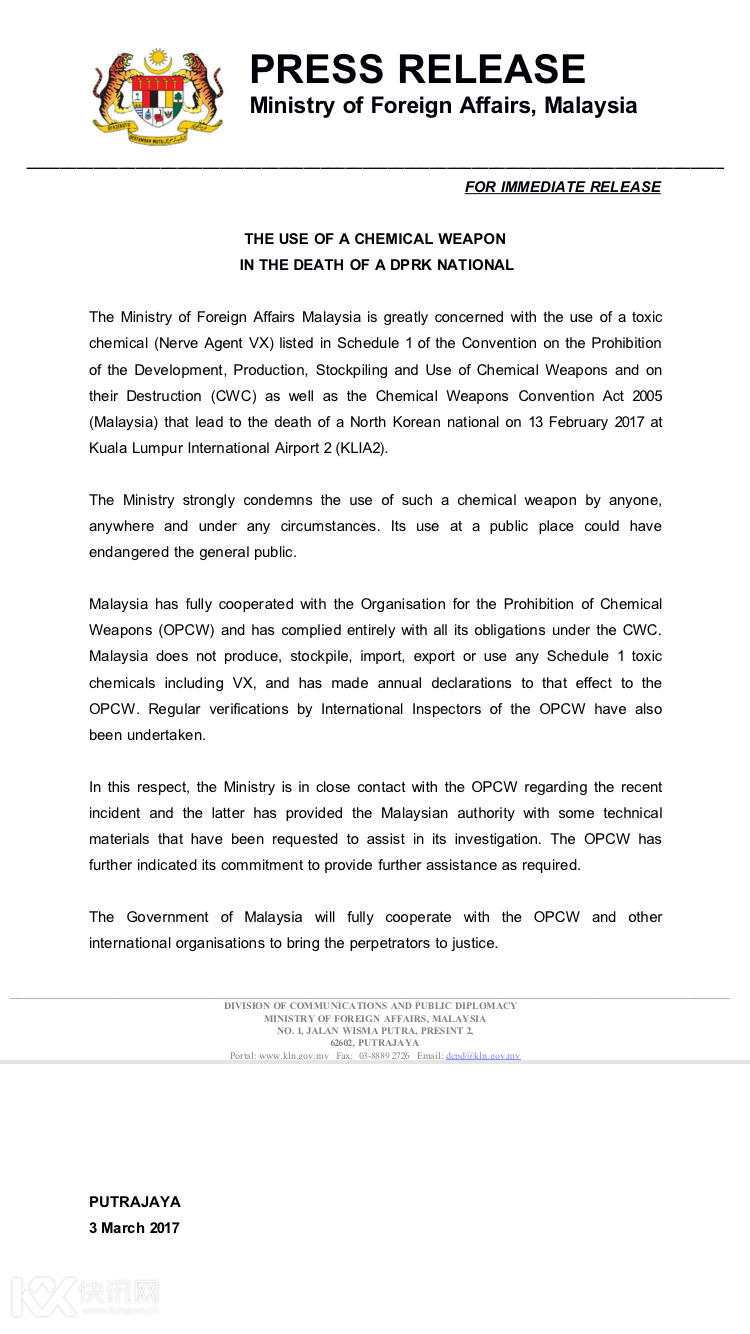 3月3日,马来西亚外交部发表声明称,根据“禁止化学武器公约”附表1所列出的有毒化学物品,以及“2005马来西亚化学武器公约法令”的相关规定,马来西亚外交部对发生在马来西亚吉隆坡第二航站楼使用VX神经毒剂并导致一名朝鲜籍男子身亡一事表示强烈关注。