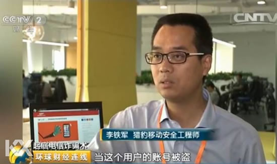 猎豹移动安全工程师李铁军:当这个用户的账号被盗,其他人或小偷在另一个位置、另一个城市,使用不同的设备去登录这个账户的时候,它的系统就会马上做出反应,可能就会停止这个账号的登录,他要消费购物,也会停止这个账号的支付功能。