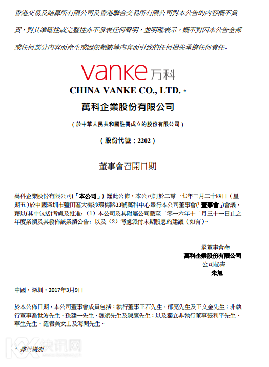 万科3月9日在港交所发布公告,将于3月24日在深圳举行董事会会议,考虑和批准2016年年度报告和派付末期股息的建议。