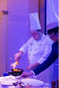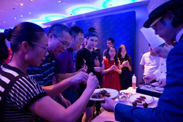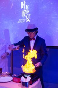本次时光晚宴以鹅肝为食材,由美食家庄臣和法国大厨联合打造的法式鹅肝大餐。精选70天的朗德鹅,经过食物填养生产出重约700~900克的鹅肝,6分钟的烹饪过程,7成熟的鹅肝,恰到好处,铸成极致美味。现场除美味不可辜负之外,优雅动人的歌声,炫蓝迷幻的灯光,奇遇香槟与红酒,与尊贵会员开启了一场前所未有的美味时光。