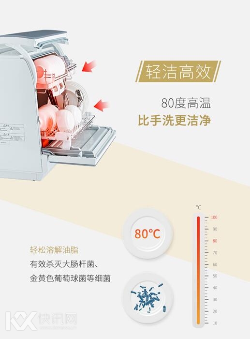 这个时候,就不能不提到洗碗机里,最重要的功能之一——高温清洗功能,也是对餐具消毒最有效的功能。就目前而言,普通家用洗碗机清洗温度都在60-70℃左右,清洗时已经能够去除大部分的细菌。不过像知名品牌松下推出的TR1系列桌上式洗碗机,在漂洗时最高温度却可以达到80℃,令它在面对金黄色葡萄球菌这种耐高温细菌时,也能做到清洗时完全去除,达到其他普通洗碗机不能达到的除菌效果。