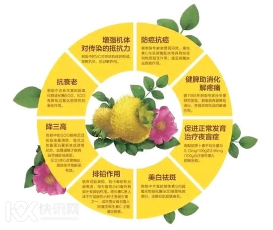 刺梨果实的维 C、维 P 和 SOD 含量量极高,每 100 克鲜果中含量 841.58毫克~ 3541.13 毫克,是苹果的 500 倍、柑橘的 50 倍、猕猴桃的 10 倍,被誉为“维 C 之王”、“三王之果”,是人类健康的稀世珍宝,最具开发潜力的药用价值是防癌、抗癌作用,民谚有云“刺梨上市,太医无事”。
