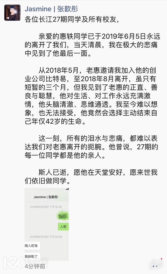 张歆彤在悼念惠轶的朋友圈中写道:“从2018年5月,老惠邀请我加入他的创业公司比特易,至2018年8月离开,虽只有短暂3个月时间,但我见到了老惠的正直、善良与聪慧,他对生活、对工作永远充满激情,他头脑清澈、思维通透。”