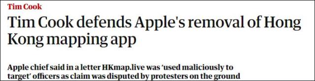 苹果CEO蒂姆·库克(Tim Cook)本人终于对下架“香港暴徒好帮手APP(HKmap.live)”做出回应。在10日发给苹果员工的备忘录中,库克对于苹果决定下架App Store 中的HKmap.live 应用程序的决定发表了自己的看法。同9日苹果公司的声明类似,库克称这款应用程序在香港抗议中“被滥用、可能威胁到公共安全”。