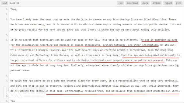 “不论技术是好是坏,对技术的应用已不是什么秘密。HMmap.live应用程序允许对警察检查站,示威地点和其他信息进行报告并在地图上予以呈现。 信息本身是没有错误的,但从过去几天中我们从香港网络安全和技术犯罪局以及香港用户处获得了可靠的信息来看,该应用程序被恶意地用来用来针对警官实施暴力行为以及侵害那些没有警察保护的地方的个人与财产安全。 这种App的使用也违反了香港法律,很显然也违反了我们的App Store准则中‘禁止对个人造成伤害’的条款。”