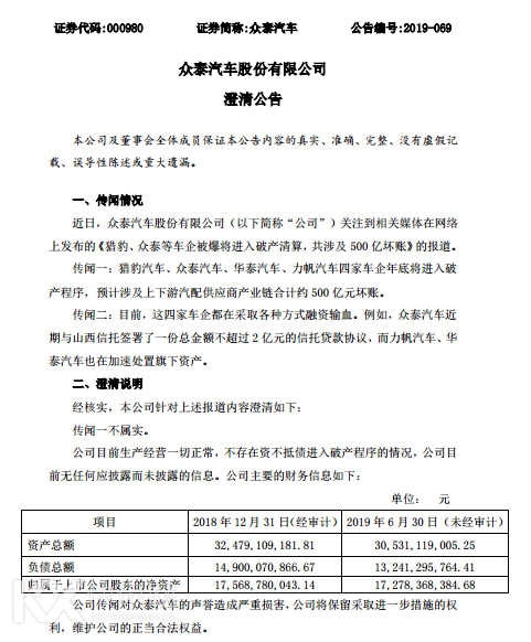 对于以上传闻,今天下午众泰汽车发布澄清公告称,公司目前生产经营一切正常,不存在资不抵债进入破产程序的情况,并表示相关传闻对公司造成严重名誉损害,公司将保留进一步措施的权力,维护公司的正当利益。