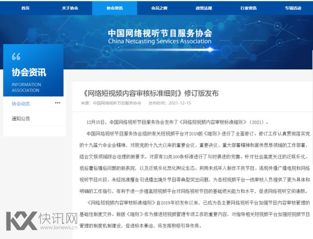 12月15日,中国网络视听节目服务协会发布了《网络短视频内容审核标准细则》(2021)。