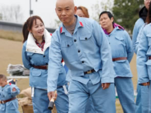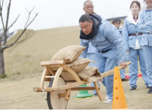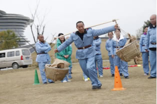 在独轮车和扁担运送军粮项目中,两支队伍需要用独轮车和扁担穿越障碍来接力运送军粮,用时最短的队伍即获得胜利,再现了当年老百姓为红四方面军运送粮食的场景。
