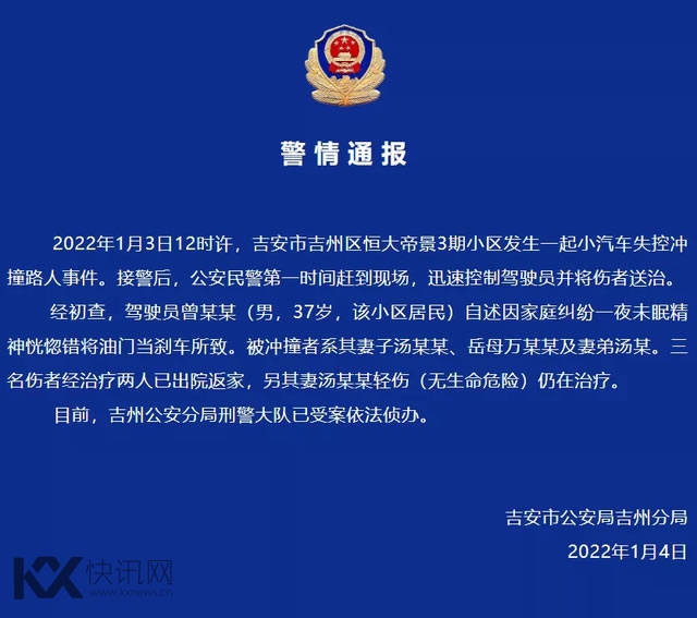 经初查,驾驶员曾某某(男,37岁,该小区居民)自述因家庭纠纷一夜未眠精神恍惚错将油门当刹车所致。被冲撞者系其妻子汤某某、岳母万某某及妻弟汤某。三名伤者经治疗两人已出院返家,另其妻汤某某轻伤(无生命危险)仍在治疗。 目前,吉州公安分局刑警大队已受案依法侦办。