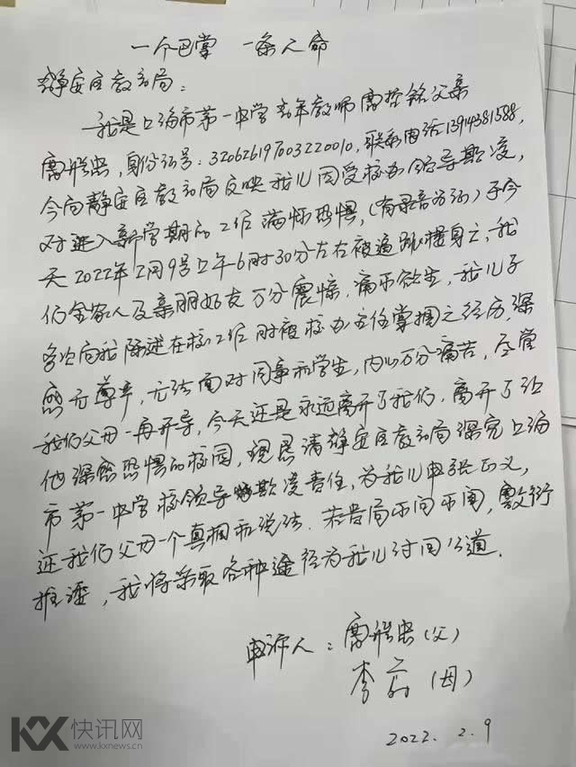 2月10日,有网友在微博上发布《#上海市第一中学##一个巴掌 一条人命#》一文。文章中透露,近日,上海市第一中学教师曹某铭跳楼自杀,家属质疑自杀原因或与曹某铭在学校中遭到领导不公正对待,以及受到某位领导掌掴有关。这篇文章引起了众多网友关注。
