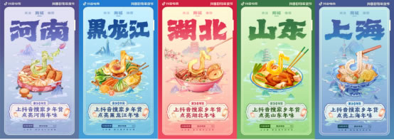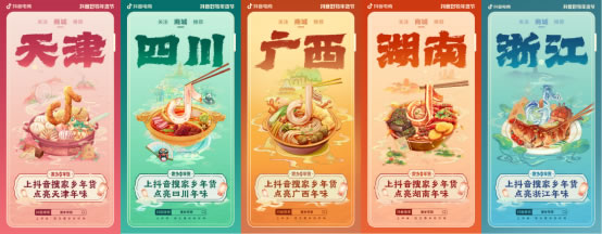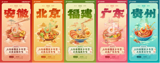 年货不仅是货,还是国人从不缺席的仪式感。新年脚步将近,抖音电商发起“抖音好物年货节—家乡年货”活动,并推出一组家乡年货地域特色海报,“浙江的东坡肉,安徽的板面……”,集合天南海北年俗年味,营造浓厚春节氛围。