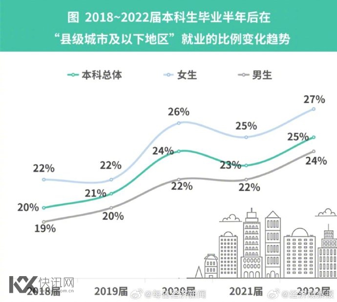 《蓝皮书》对近五年大学毕业生的跟踪统计发现,应届本科生毕业半年后,在县城就业比例明显上升,从2018届的20%上升到2022届的25%,增长了5个百分点。其中,男生从2018届的19%上升到2022届的24%;女生从2018届的22%上升到2022届的27%。